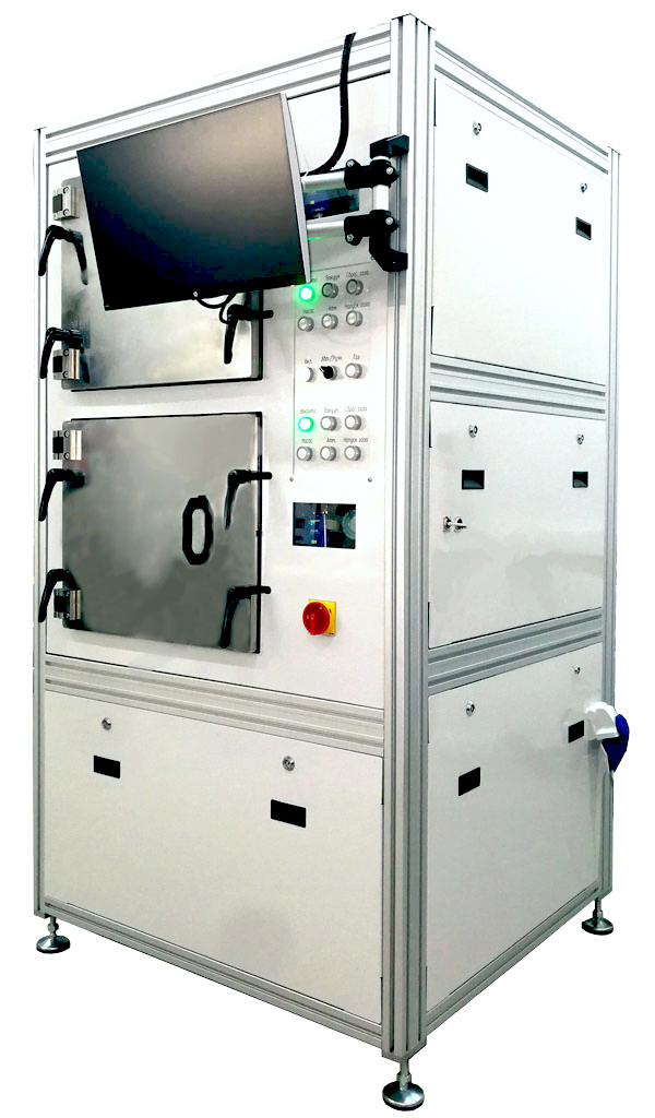 Оборудованы двумя вакуумными камерами, в одной происходит опрессовка изделий пробным газом, а в другой испытание опресованных изделий на герметичность масс-спектрометрическим методом.