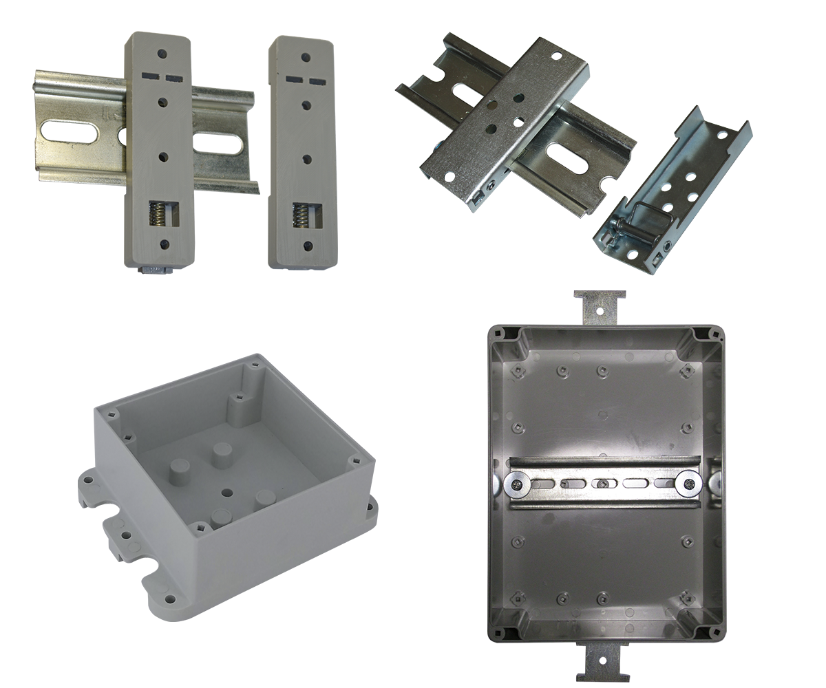 - Крепления для монтажа на рейку DIN: пластмассовые и стальные вибростойкие;