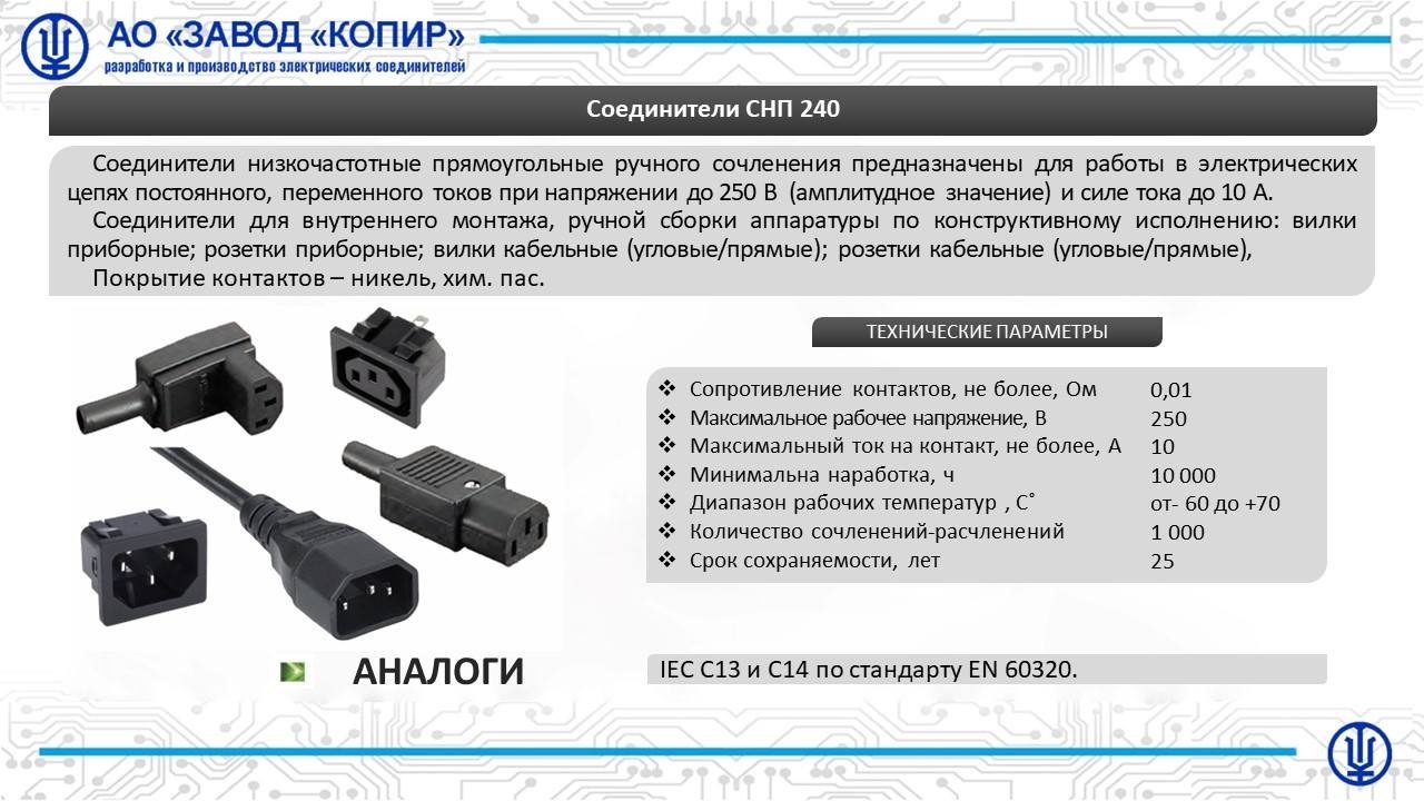 Соединители низкочастотные прямоугольные ручного сочленения предназначены для работы в электрических цепях постоянного, переменного токов при напряжении до 250В и силе тока 10А. Для внутреннего монтажа по конструктивному исполнению: розетки приборные вилки приборные и кабельные (угловые/прямые). Аналоги разъемов IEC С13 и С14 по стандарту EN 60320