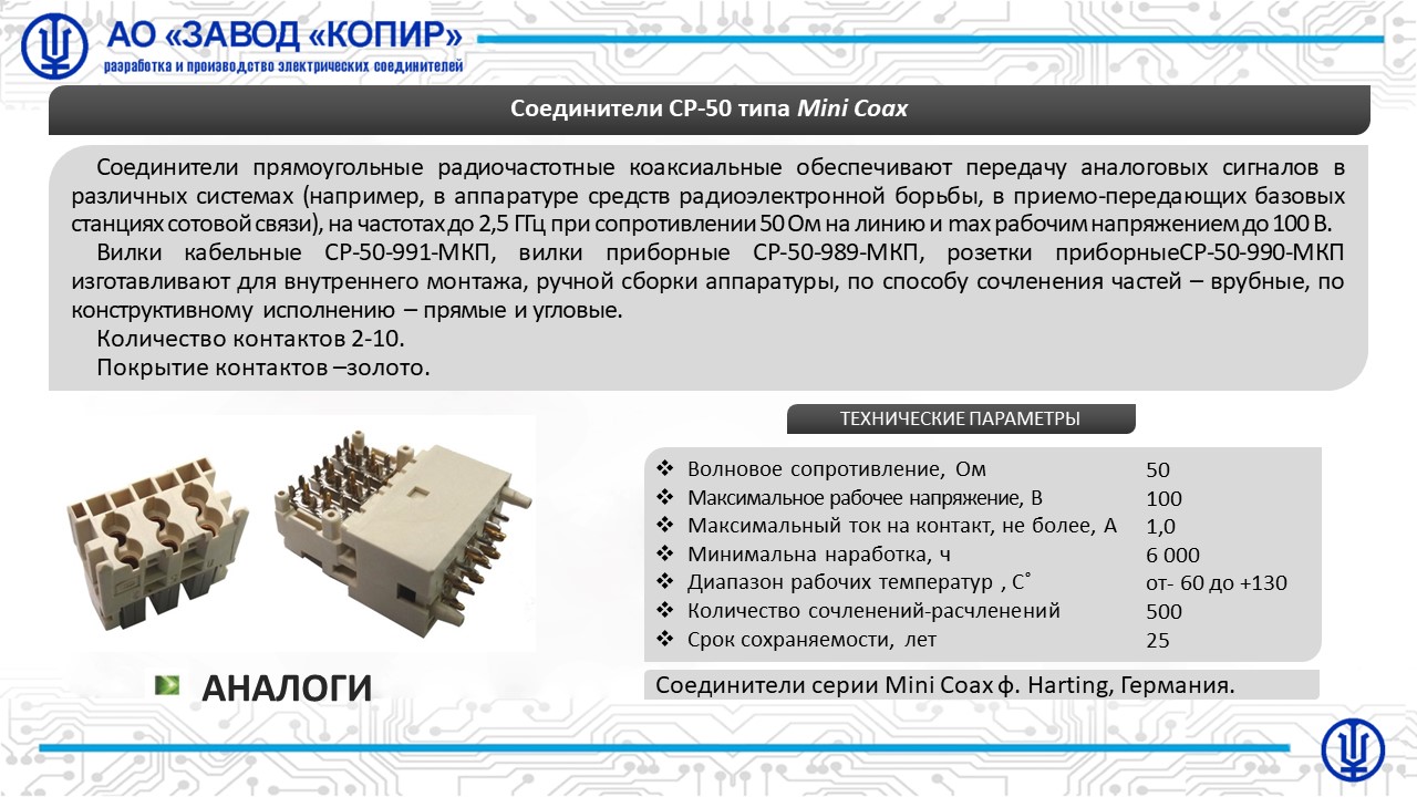 Соединители прямоугольные радиочастотные коаксиальные СР-50 типа MiniCoax обеспечивают передачу аналоговых сигналов в различных системах (например, в аппаратуре средств радиоэлектронной борьбы, в приемо-передающих базовых станциях сотовой связи), на частотах до 2,5 ГГц при сопротивлении 50 Ом на линию и max рабочим напряжением до 100 В.