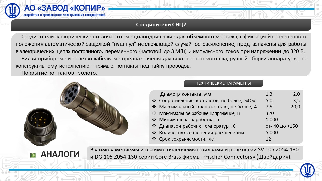 Соединители электрические низкочастотные цилиндрические для объемного монтажа, с фиксацией сочлененного положения автоматической защелкой "пуш-пул" исключающей случайное расчленение.