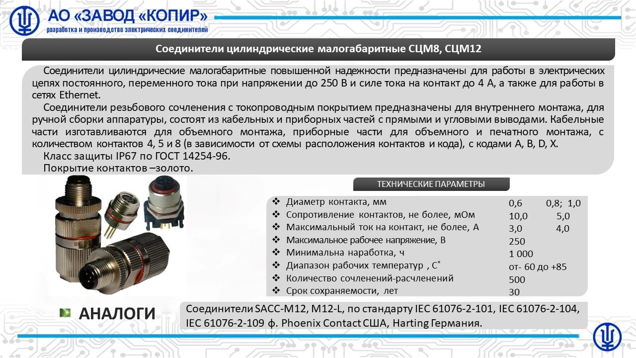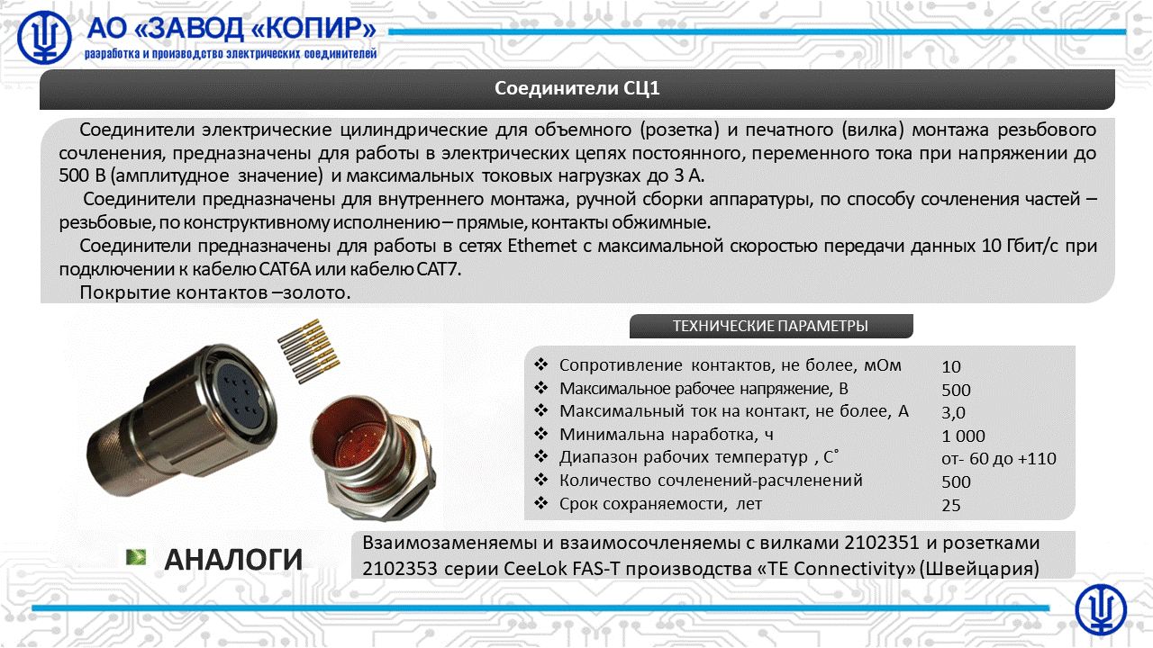 Соединители цилиндрические для объемного (розетка) и печатного (вилка) монтажа резьбового сочленения, предназначены для работы в электрических цепях постоянного, переменного тока при напряжении до 500В и максимальных токовых нагрузках до 3А. Соединители предназначены для работы в сетях Ethernet с максимальной скоростью передачи данных 10 Гбит/с