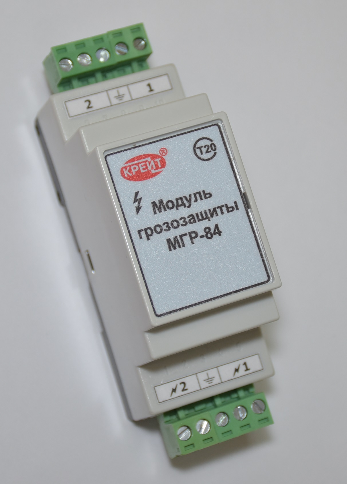 Модуль грозозащиты МГР-84 – устройство ограничения импульсных перенапряжений. Предназначено для защиты других устройств от повреждения импульсами высокого напряжения, которые могут возникать в проводных линиях связи в результате действия электромагнитных помех, например, при грозовых разрядах или коммутациях силовых линий
