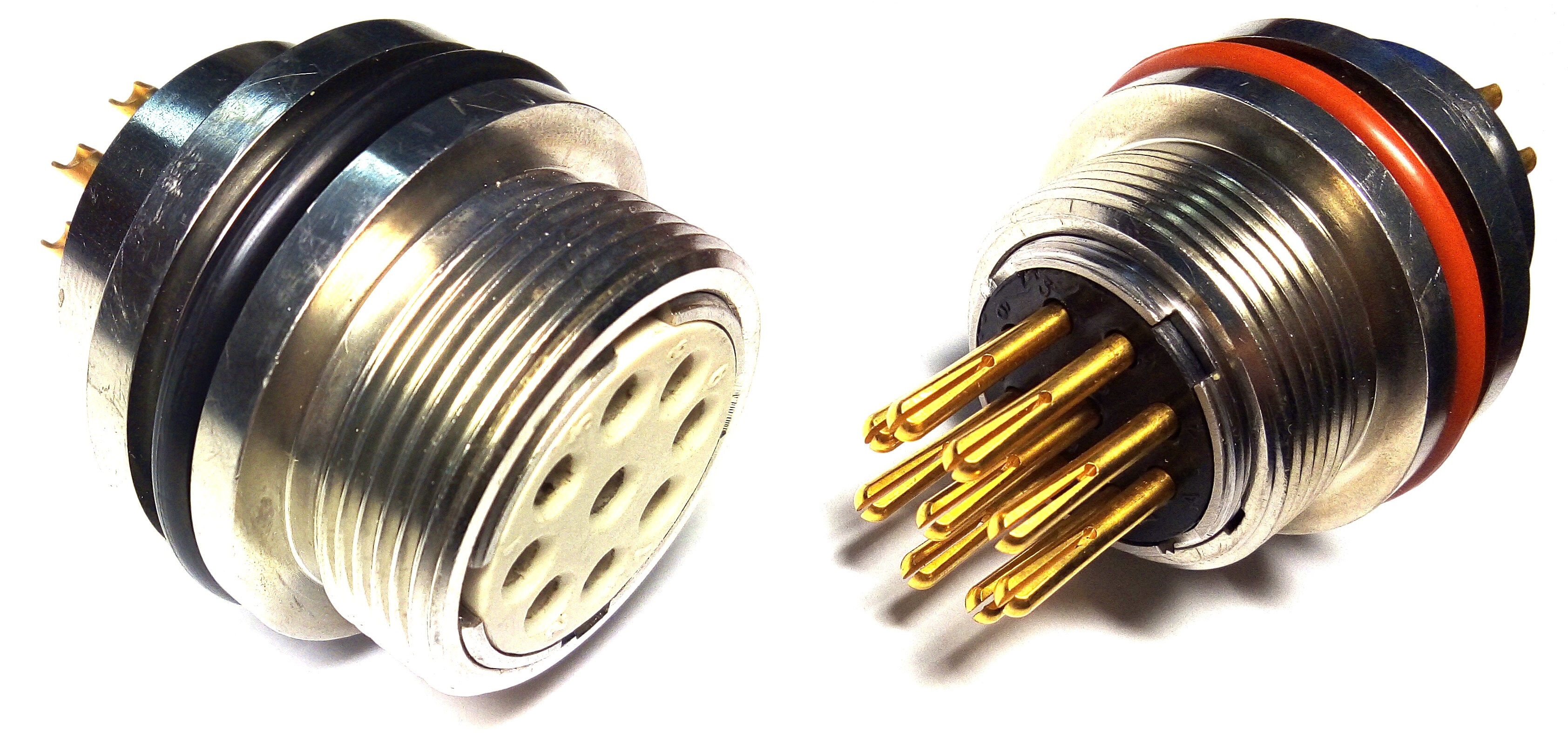 Разъемы предназначены для работы в электрических цепях постоянного, переменного (частотой до 3МГц) и импульсного токов. Технические характеристики: максимальное давление 120 МПа, сопротивление изоляции 5 000 МОм;суммарный ток 30А, 38А; рабочее напряжение-380В; материал корпуса-нержавеющая сталь; покрытие контактов- хим. никель, золото.