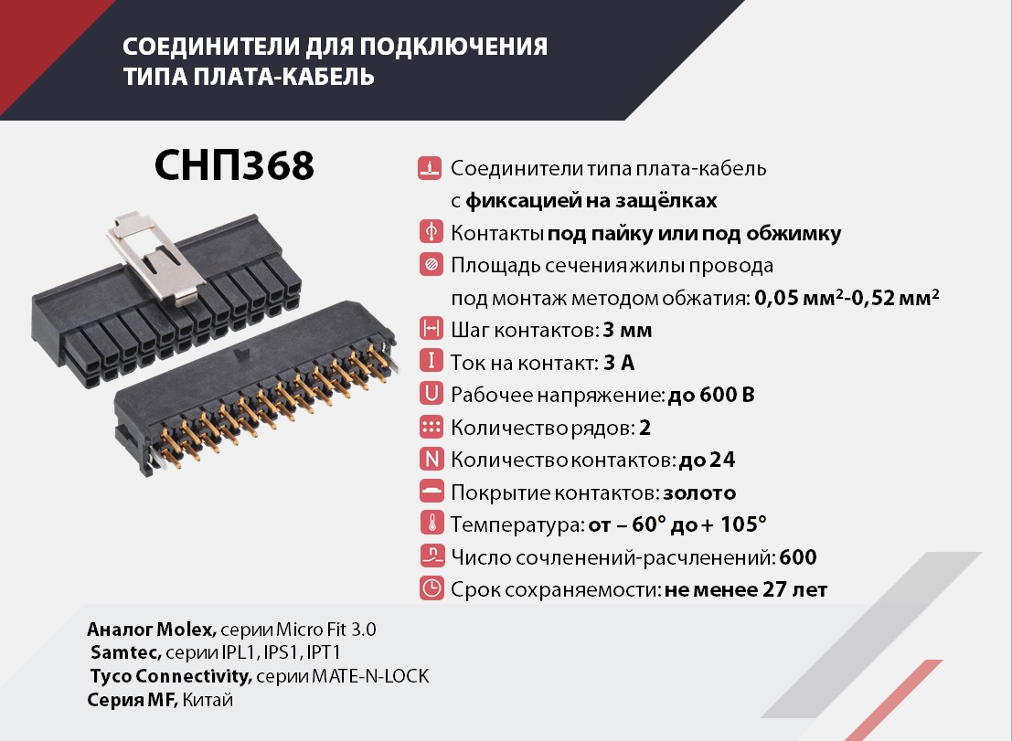 Миниатюрные соединители для подключения типа плата- кабель.Фиксация ответных частей осуществляется на защелках или винтах для обеспечения высоких требований по вибрации и ударным воздействиям. Имеют надежный гнездовой цанговый контакт, обеспечивающий высокие показатели по электрическим параметрам и механическим характеристикам.