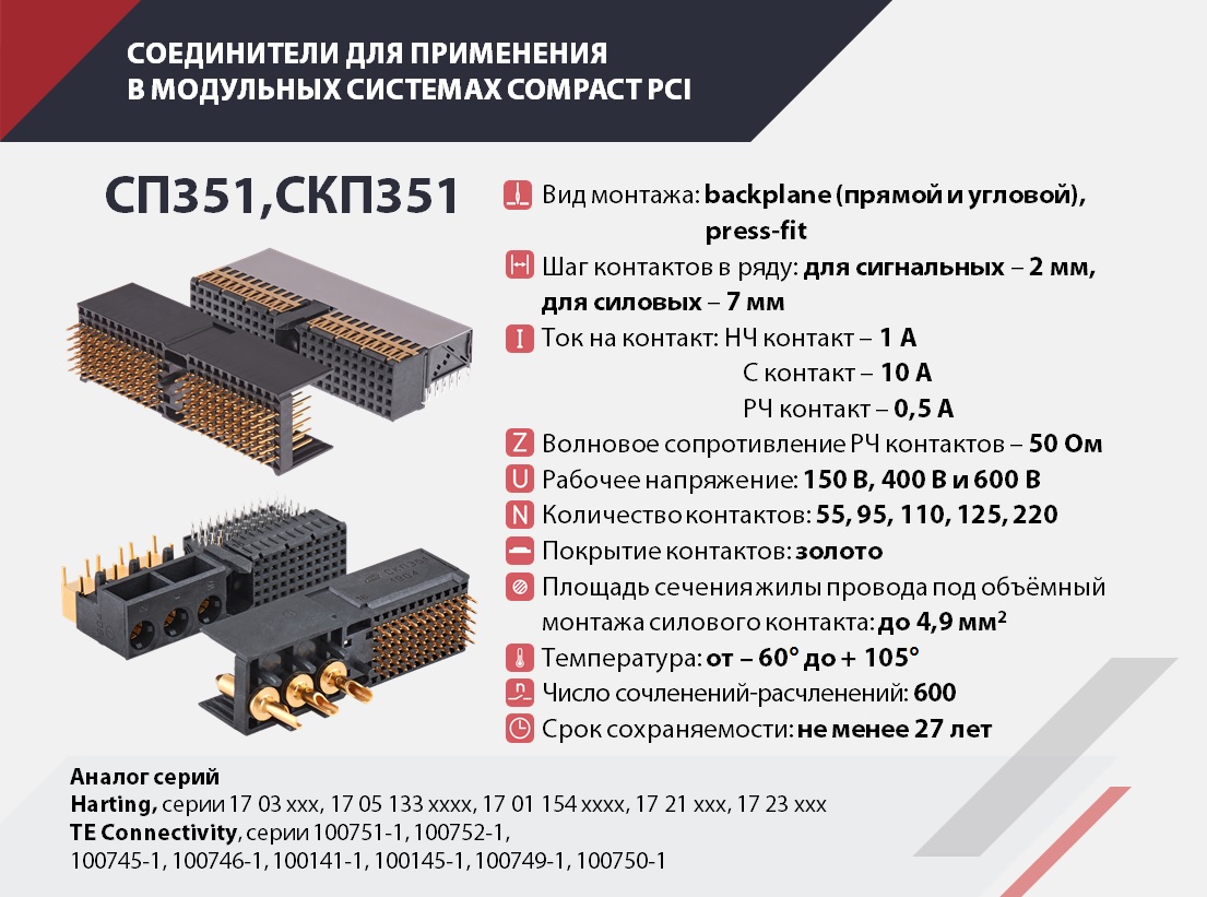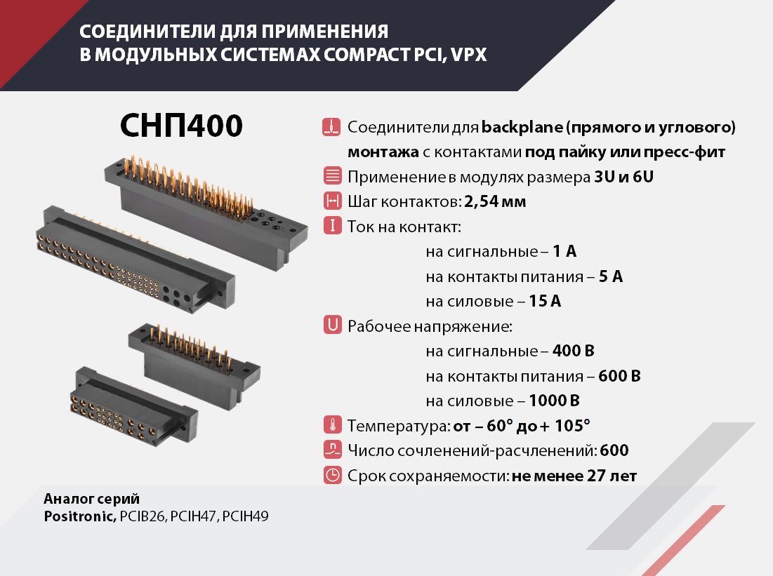 Соединители с цанговыми контактами повышенной эксплуатационной надежности для печатного, объемного и комбинированного монтажа, предназначены для работы в цепях управления и питания модульных систем CompactPCI VPX специального и общепромышленного назначения.