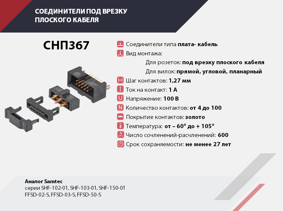 Прямоугольные соединители печатного монтажа для соединения печатных плат с плоским ленточным проводом, присоединяемым способом врезания, повышенной эксплуатационной надежности для использования в информационных цепях управления и электропитания РЭА.