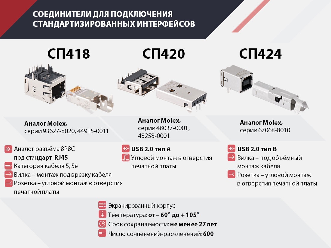 Соединители с цанговыми контактами повышенной эксплуатационной надежности для прямого монтажа в отверстие печатной платы и объемного монтажа методом пайки, предназначены для работы в электрических цепях постоянного, переменного и импульсного токов в радиоэлектронной аппаратуре специального и общепромышленного назначения.
