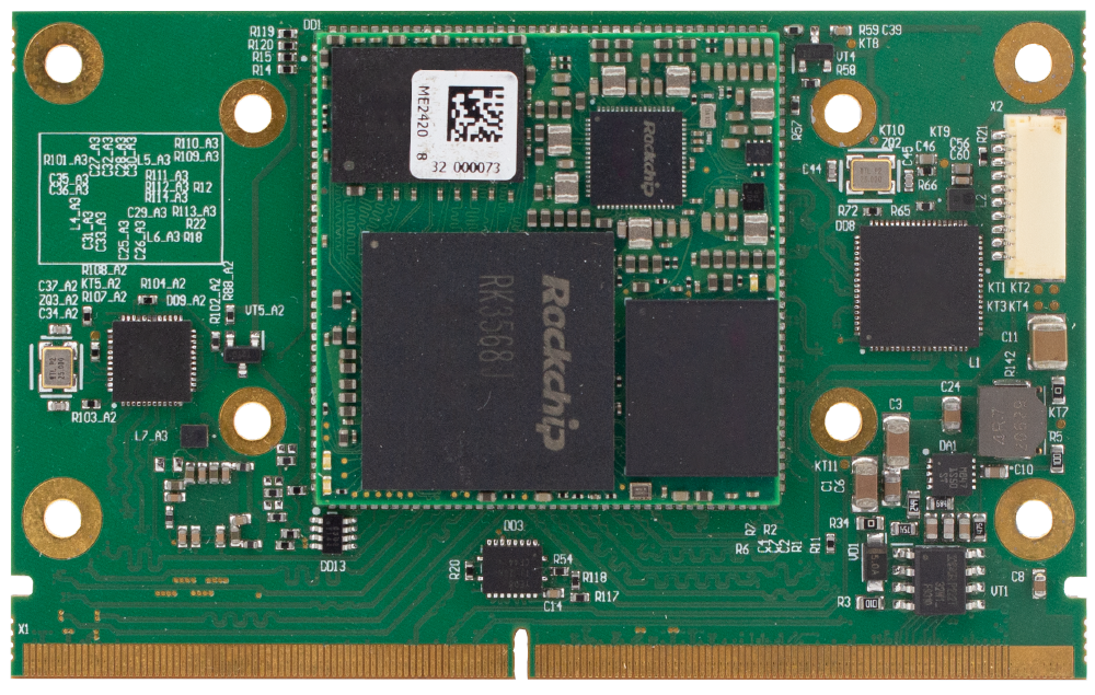 Мини SOM на основе производительного процессора Rockchip RK3568 с 4 ядрами ARM Cortex-A55. Компактные габариты 35х35 мм. Выполнен для SMD монтажа на базовую плату.
