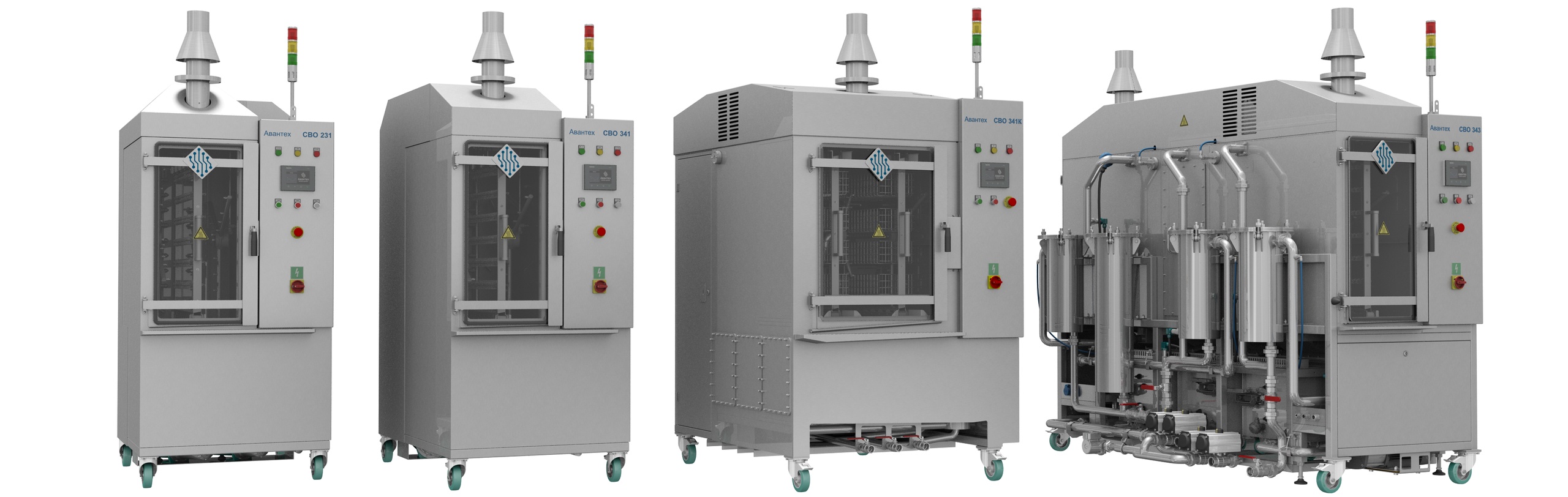 Системы серии СВО используют технологию распыления струи жидкости в воздухе. Вертикальное расположение печатного узла обеспечивает прямое воздействие струи на всю площадь изделия, что сводит к минимуму эффект «затенения», наблюдаемый в системах отмывки с корзинным (горизонтальным) методом загрузки.